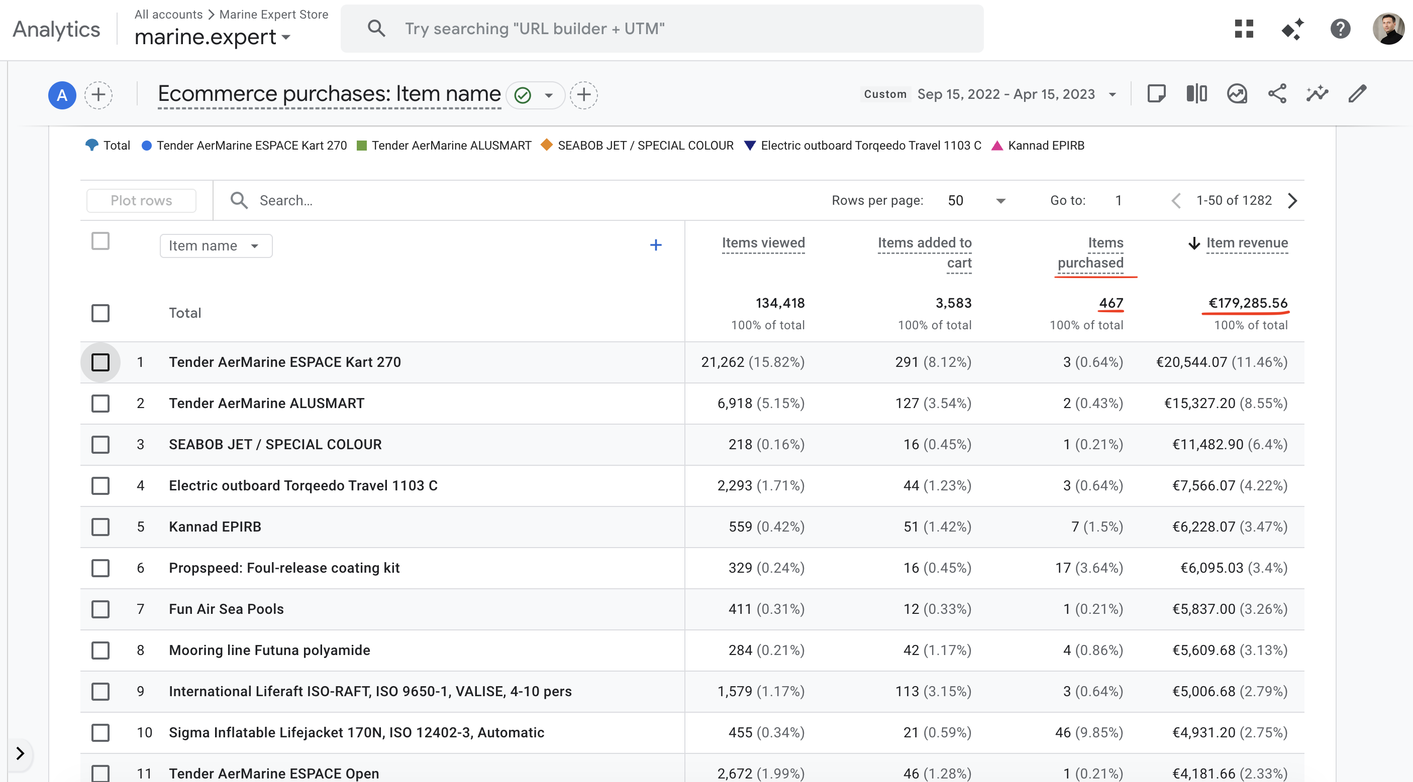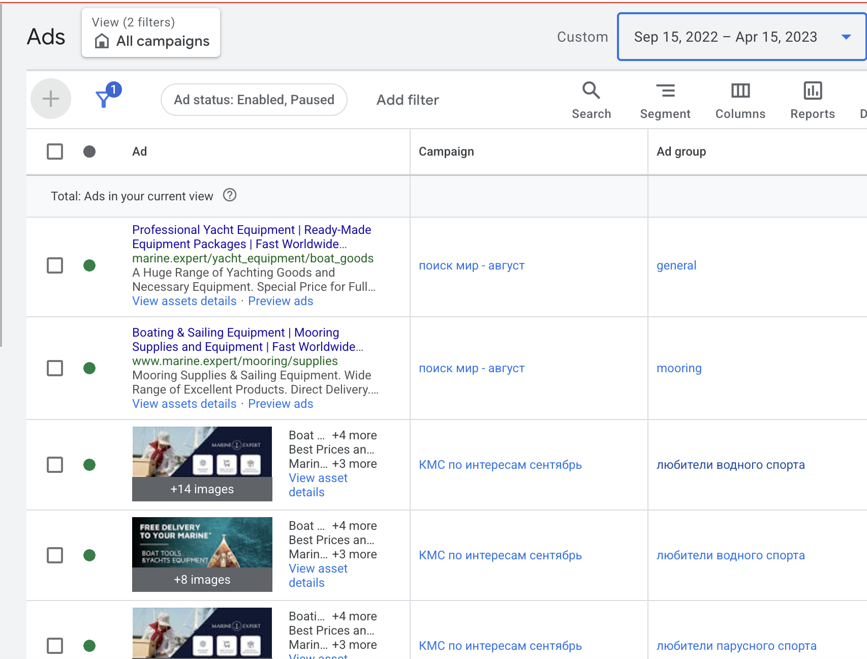 Онлайн магазин яхтенного оборудования и экипировки, запускалась глобальная рекламная кампания в Google Ads на поиск и контекстно-медийную сеть. Была проделана комплексная работа по настройке аналитики и оптимизации рекламы, что в совокупности за 8 месяцев работы при рекламной бюджете 27.000€ дало выручку в размере 179,285.56€.